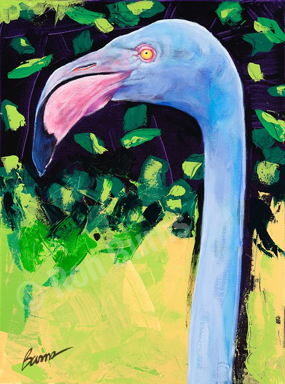 As a kid, growing up in a small town in Ohio, I cherished our trips to the Toledo Zoo. It was a very special family day out, picnic included. Upon entering the zoo, the first animal to see was always the flamingos. I remember standing in awww of their stature and beautiful colors.  I met “Lady Blue” in January of 2025 at the Phoenix Zoo to prepare for an exhibit at the Zoo’s Wild Side Gallery. I combined my newfound love of using a palate knife, in the background, along with my signature style for painting animals.